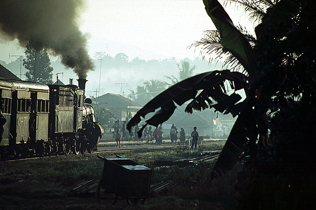 A B51 drifts into a wayside station on the Labuan branch as the early morning sun lights up the side of the train on 30th July 1983. (KC) |
