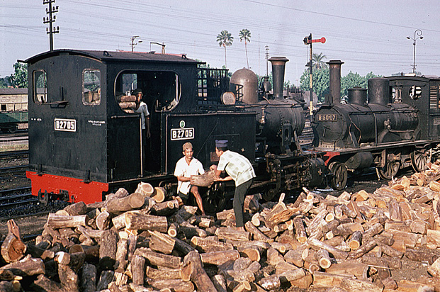 B2705 is ex-works as it is fuelled from a huge pile of logs outside Madiun shed in July 1973. It would have been sent back to its home shed at Purwodadi shortly afterwards. B5007 was, of course, at home. (JT) |