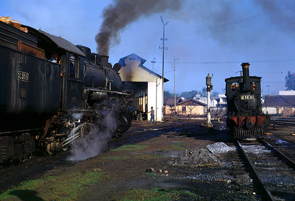 Java offered the most bizarre extremes of size. Little and large are represented by B5001 and CC5015 in the shed yard at Madiun in July 1972. (BP) |