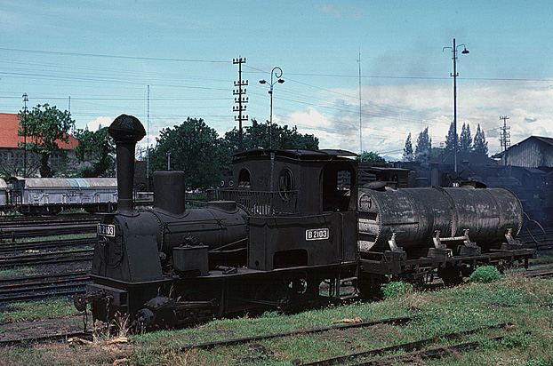 B2103 lies sidelined at Madiun on 5th September 1978. Two years before it was the shed 'pet'. Given that no locomotives were now going into the next door works, it must be unlikely she ever worked again. (NT) |