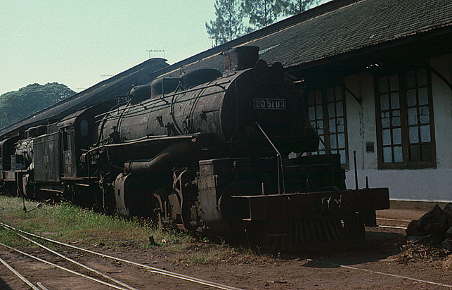 One of the first sights to greet visitors to the Balai Yasar (locomotive works) at Madiun was the giant hulk of DD5103 as it did me on 6th August 1975. Alas it did not survive long enough to be preserved, there being only the European built Mallets now in the museums at Ambarawa and Jakarta. (RD) |