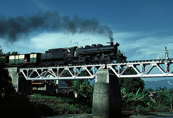 CC5012 drifts on to the river bridge beyond Garut station with the 05.30 from Cibatu. Ahead lies an almost continuous climb to Cikajang. (TE) |