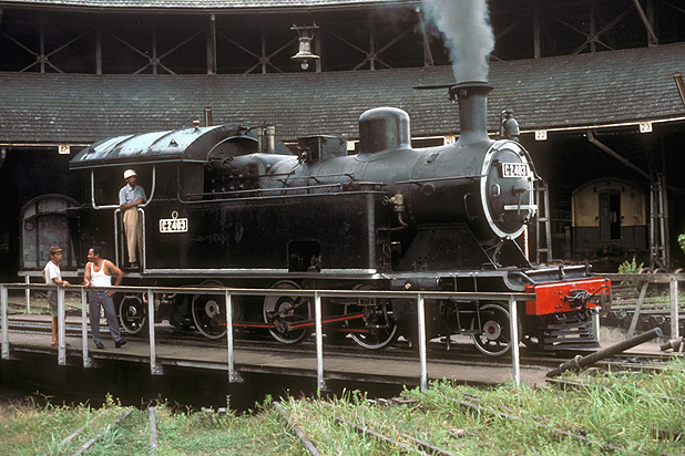 This is another view of C2403 on the same day. The C24 class were originally used on local trains on the main line between Solo and Yogya and on the branch line north from Yogya to Magelang. The former were dieselised and the branch closed by an earthquake and by now there was little work for the class. (RD) |