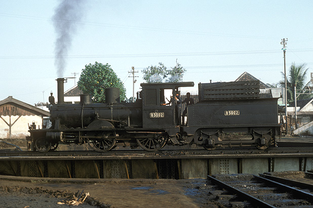 My first visit to Madiun was a big disappointment as the regular train service on the Slahung branch was suspended and we saw no more than a short B50 trip to the oil terminal near Rejoagung sugar mill. B5002 was then an oil burner seen on the turntable at the shed getting ready for the duty on 5th August 1975. (RD) |
