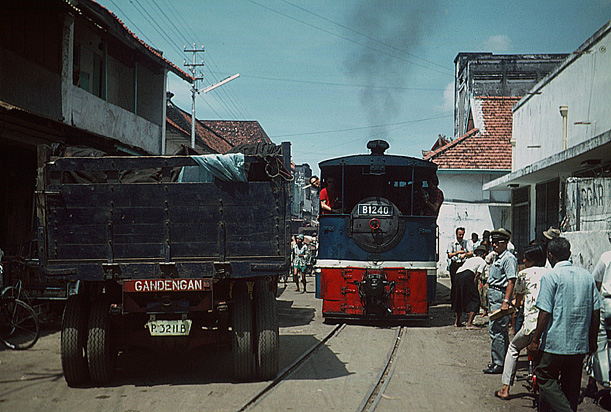 'Gandengan' indicates that B1240 has met a trailer lorry in the back streets of Surabaya near Kebonrodjo on 7th May 1973. This was a daily hazard of operation. (PM) |