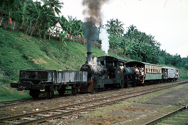 C1704 arrives at Wonogiri on a Purwosari to Baturetno train on 1st May 1973. On a preserved railway in Europe, the photographer would long since have given up and gone home, so poor was the light, but this was a unique opportunity. (RF) |