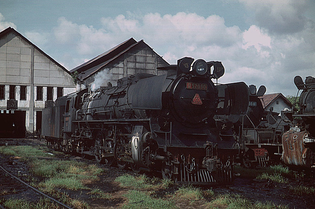 Sidotopo had a large allocation of D52s for working heavy freight trains along the main line, although in relation to their numbers, few pictures seem to have been taken. It was easier to photograph their cousins at work in Europe. D52090 is outside the shed on 7th May 1973 in a sea of black bunker oil. (PM) |