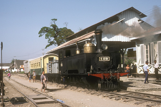The smart passenger coach indicates that this train is not what it appears to be. C1201 heads up what must have been the last train ever at Cepu Kota for a visiting party of railfans on 20th August 1983. (RD) |