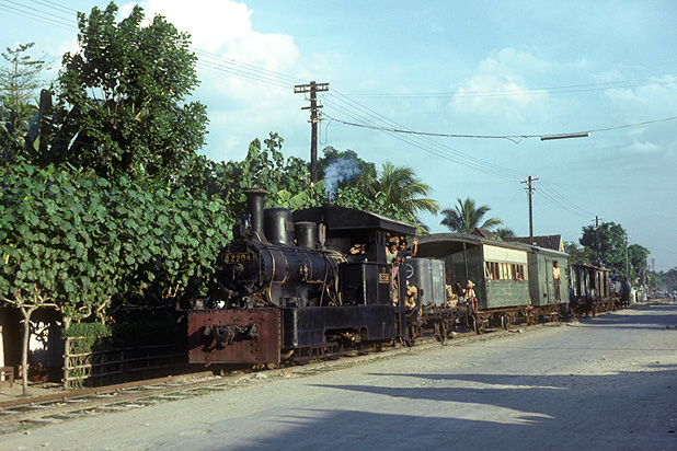 I had spent a day and a half in Purwodadi because staff told me B2204 would work the following afternoon to Wirosari and Kradenan. The train was inevitably late and the shadows were stretching longer and longer as I captured a rare master-shot of a skirt tank on the line, with well behaved water tanker, 27th May 1976. (RD) |