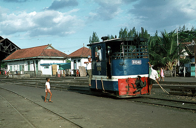 B1240 has uncoupled from its coaches and is heading for the shed at Wonokromo in July 1973. To his eternal regret, the photographer's schedule did not allow him to actually travel on the tram. (JT) |