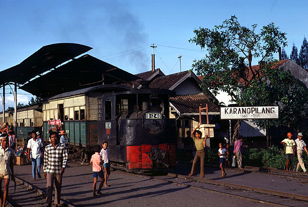 The far extreme of the tram system was nearly rural Karang Pilang. B1240 waits to work a train back into the city in July 1972. Considering the novelty of foreign visitors at this time, the locals seem relatively uninterested in them. (BP) |
