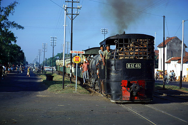 Although Indonesia 'drives on the left', the railways keep right. Only in Surabaya with its double track tramway did this seem an anachronism. B1245 heads for town in July 1972. (BP) |