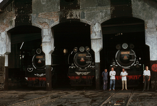 Cirebon's fleet of D52s was always immaculately turned out. Here a trio of locomotives await the call to duty at their home depot on 26th April 1977. (RD) |