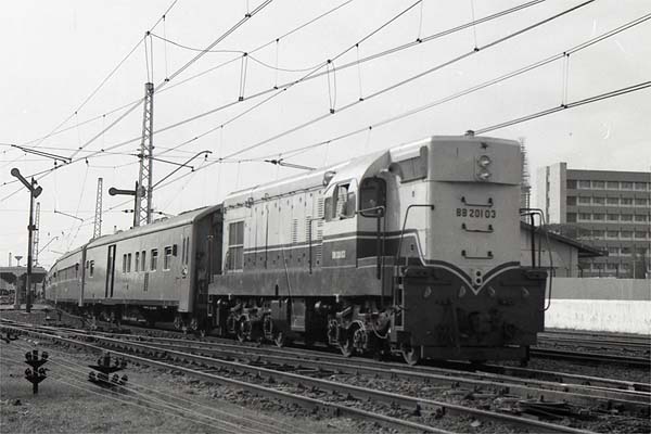 Allan and John arrived in Jakarta a couple of days early and the pictures on this page were taken 'pre-tour'. By 1973, the long distance trains in and out of Jakarta had been dieselised for some time. BB201.03, dating from 1964, is in charge of a train for Solo which is leaving Gambir station. This and the picture following were taken on 29th July 1973.