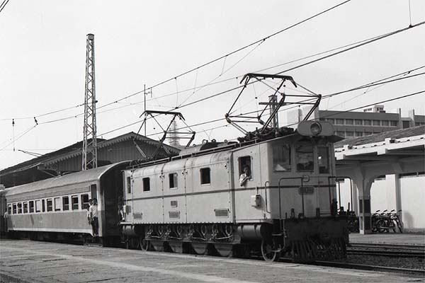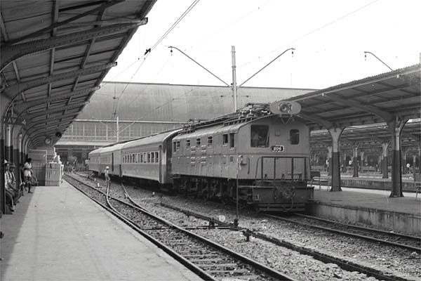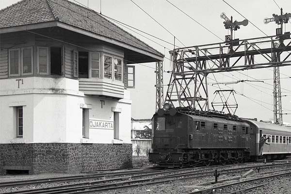 Several of the lines within Jakarta and that out to Bogor had been electrified at 1500V DC more than 40 years earlier. The electric multiple units had all been withdrawn from service but various original electric locomotives survived. 1 (Brown Boveri / Wintherthur) is arriving on a train from Bogor.