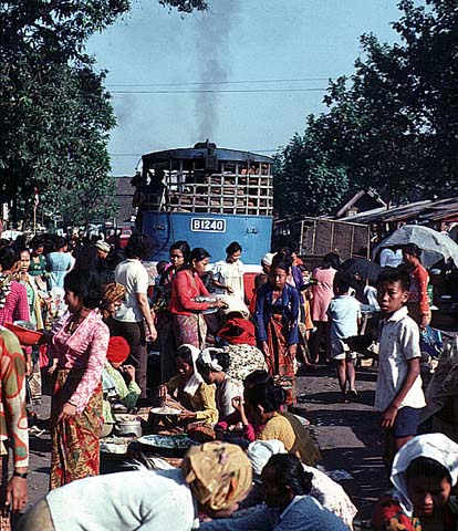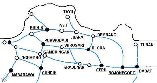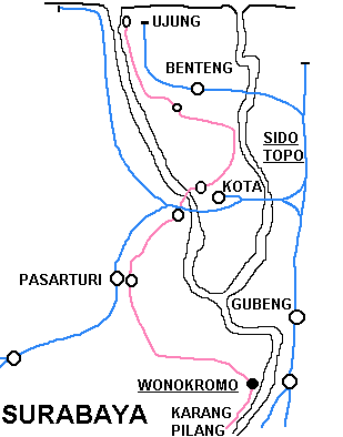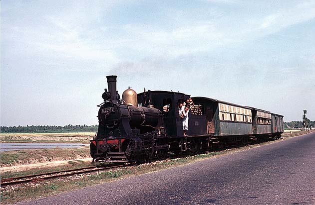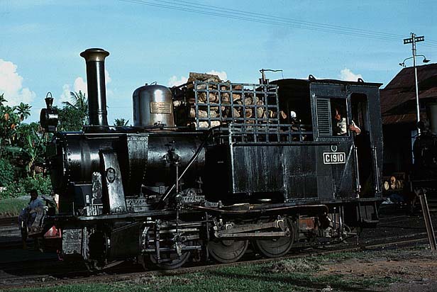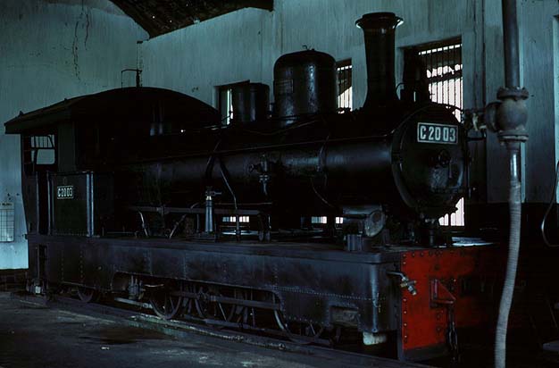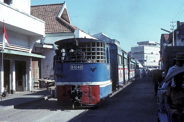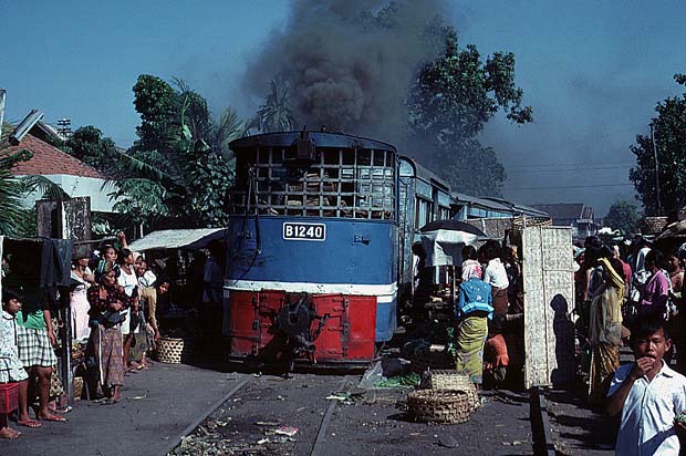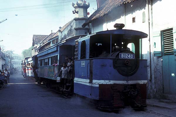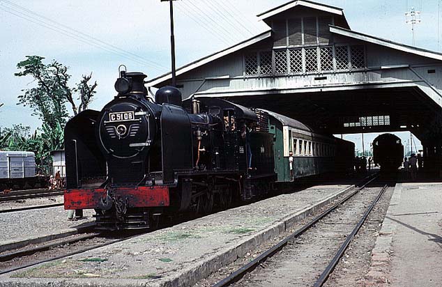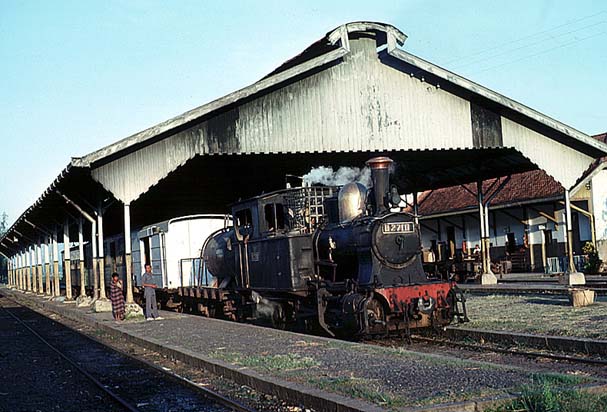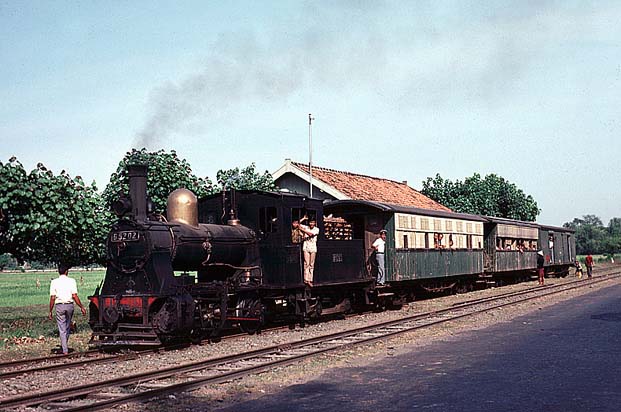 These pages are a sentimental record of a long gone age when all that was needed to enjoy a good grice was a smile, a lot of patience and a willingness to put up with a small amount of discomfort... Part 1: Introduction, Jakarta to Purwokerto (including Cibatu, Banjar, Maos and Kroja) Part 2: Purwokerto to Madiun (including Kutarjo, Yogya and Solo) Part 3: Madiun to Blitar (including Kertosono, Kediri, Pare and Tulungagung) Part 4: Blitar to Cepu (including Mojokerto, Bangil, Malang and Probolinggo) Part 5: Cepu to Semarang (including Kudus, Surabaya and Purwodadi) Part 6: Semarang to Jakarta (including Pekalongan, Tegal, Prupuk, Cirebon, Rangkasbetung) 23rd May 1976 I paid an early morning visit to the shed at Cepu. There was then time to photograph C5108 before departure to Bojonegoro, ride it out to the first station and then catch a bus back to town to collect my bag. On I went to Blora where the only active steam was on workings from Purwodadi although C2003 was stored here in good condition. I made my way on to Kudus which struck me as one of the most pleasant towns in this rather poor area of Java. On my way into town we passed one of Rendeng's unusual 900mm gauge locos next to the road: A clean but oily C1910 was in steam with little work to do, but most importantly the daily train to Rembang and back was still steam and would be in the hands of B5202 next morning. This would suit my plans perfectly as the first step of my journey back to Surabaya. 24th May 1976 B5202 left Kudus long before the light was good enough for photography. Once the sun was high enough, I was able to shoot the train at most of the relatively few stations but I was itching for some kind of lineside shot. There was a lengthy wait scheduled for Juana, so I jumped on a bus. Alas, this was arguably the least interesting section of roadside tramway in the whole of Java. Few people live here and much of the land is given over to salt pans. I waited in vain for something promising but by the time we were almost in Rembang I had to give up. The train rolled past me with no visible sign of movement and I had such a long wait for a bus that there was no point in investigating it further - the shed at Rembang was known to have been dieselised for some time. I carried on with the bus back to Cepu and (no doubt) an afternoon train back to Surabaya. Where I stayed to keep within budget I have no recollection, most likely it was near Kota station. 25th May 1976 I had seen limited success with B1221 on the Surabaya steam tram the previous year. However, at the time I was learning the ropes in Java and opportunities were bound to be limited when you are part of a group of nearly twenty riding the train - the traffic in the modern parts and the narrow streets near the port precluded any serious attempt to chase. On this occasion, I had the tram to myself. I made my way in good time to Wonokromo and waited for it to arrive from its early morning run out of town to Karang Pilang. Unlike most tank locos, tram locos are effectively bi-directional and I had an extremely pleasant morning riding, hopping on and off and photographing it. This was outbound with the sun still low: This was the scene at Benteng when the tram station had long doubled as an open air market. It was now the terminus as the line on to Ujung had been abandoned and this caused chaos with vegetables abandoned between the rails as the loco ran round and then departed : Then later in the middle of Chinatown Long before midday, I was more than satisfied and had plenty of time to catch an afternoon train to Cepu. 26th May 1976 One of our less satisfactory visits in 1975 had been to Purwodadi towards the end of a long day which started in Surabaya and ended in Semarang taking in Bojonegoro and Cepu as well, much of it on appalling roads. From Cepu to Purwodadi the clever way seemed to be to take a local train with a C28 to Gambringan and then make the short hop by bus as the rail service had been abandoned. And in due course so it all worked out, although Purwodadi was a sizeable town, it proved to be probably the most run down place I stayed in. I had hoped to make a flying visit and bag a couple of their several B27s in action but when I got to the shed I found very well presented B2204 tucked just inside the shed next to a notice that pronounced it also to be a 'runner'. Unfortunately, its next excursion would be the following afternoon and if I wanted to see a skirt tank in action then I had no alternative but wait. If the losmen was forgettable then so was the dinner but first I had the consolation of seeing B2701 roll out of town to the east. 27th May 1976 With B2204 promised for the afternoon, the obvious way to fill in was to take the pre-dawn train to Demak, especially as the return working would be smokebox first in good light. B2710 made fair progress and we got to Demak at sunrise. In almost no time it was ready to return and I climbed into the cab. The first part of the journey was away from any kind of motorable road, but when we got to the principal intermediate station of Gondang, I was able to transfer to a succession of colts with which I 'chased' the train back to base. On at least one occasion, the occupants were so amazed by my activity that I was able to reboard once the train had passed. There was still some considerable time left before the B22 performed so I took another train with B2701 east to Wirosari and returned by road. My target was the late afternoon train to Kradenan and it was clear that the only place where the light would be at all favourable would be on the outskirts of Purwodadi where the line ran north for some way before turning east. Fortunately the rails were on the east side because it set out half an hour late, just before the lengthening shadows ruined the shot. It was to prove another long day, but as satisfying as any, since my schedule demanded I get to Semarang afterwards - not least because I could not face anoth