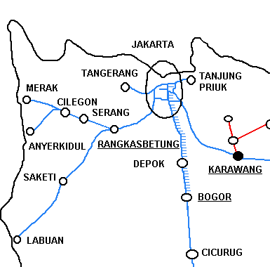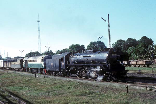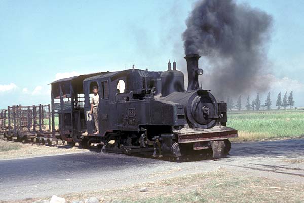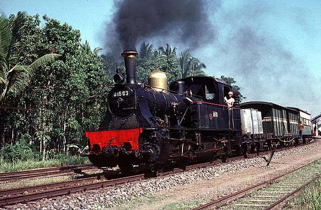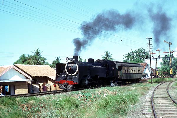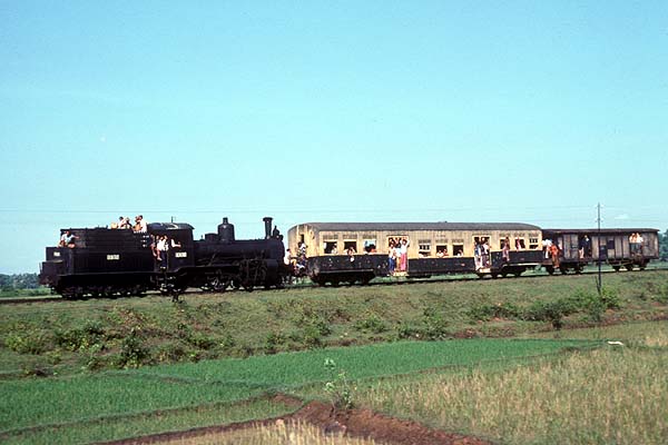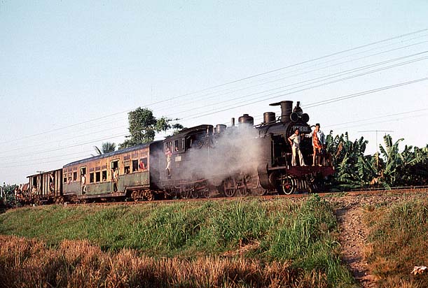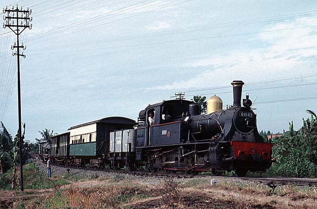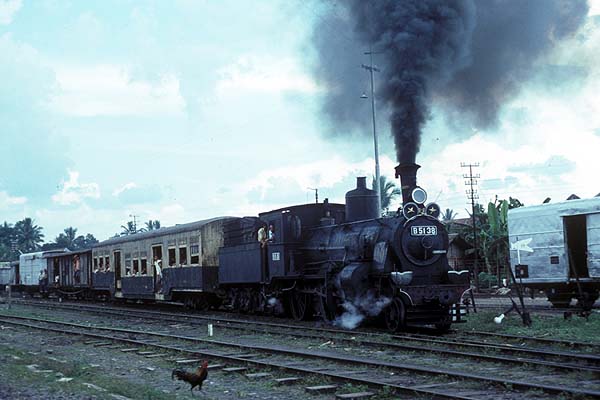 Ironically, as the loco rested waterless we were drenched by a tropical downpour. It was very gloomy by the time the Mallet arrived and when the cavalcade got to Rangkasbetung, it was long after dark. In the whole trip I had managed to avoid spending even Rp 1000 (USD 2.5) on a bed for the night and it was a matter of pride to maintain my record. I toured the town by becak but there was nothing on offer to maintain the budget. With a departure booked for 04.00, the simplest thing was to bed down on the station 1st June 1976 Apart from steam on the trains back to Jakarta, there were local workings west to Labuan (B51, afternoon out and morning back) and north-west to Anyerkidul (CC10, morning out and afternoon back). So given that I was running out of time, I had no choice for my ride, it was fortunate because by the next time I returned next year the big Mallet tank had expired and B51s were in charge of both workings. The candles in the coaches blew out immediately CC1009 departed as the windows had long lost their glass. At Banten I left the train, thereafter the line would turn west and in any case I had to get back to Jakarta. As always seemed to happen with CC10s, the forward low pressure cylinders were leaky, what should have been a rare mastershot became another run-of-the mill shot.