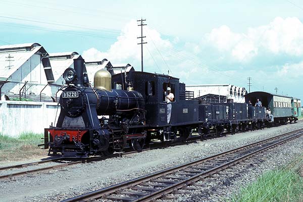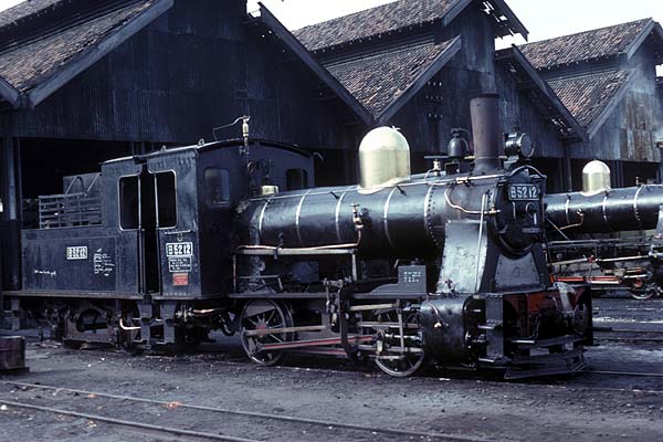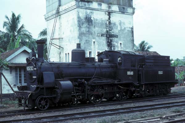 In retrospect, I should have asked at the station but instead I went back to the main road and took a bus on to Tegal. However, I had to take a break midway when Sragi 13 was seen approaching, yes that is the main north coast road in Java in the picture... I blame this encounter for my later complete fascination with Java sugar steam, it inspired me to ask my late friend Peter Michie for a copy of the loco list compiled by earlier visitors, which is basically the one which is available elsewhere on this website. At Tegal station I was directed to the shed where I found an array of gleaming locos of classes B22, B52, D10 and D15. Of these it seems that only B2207 was in steam, it was said to shunt the harbour branch but it never turned a wheel during my stay. This was B5212 outside the shed.