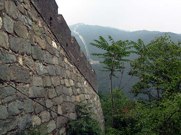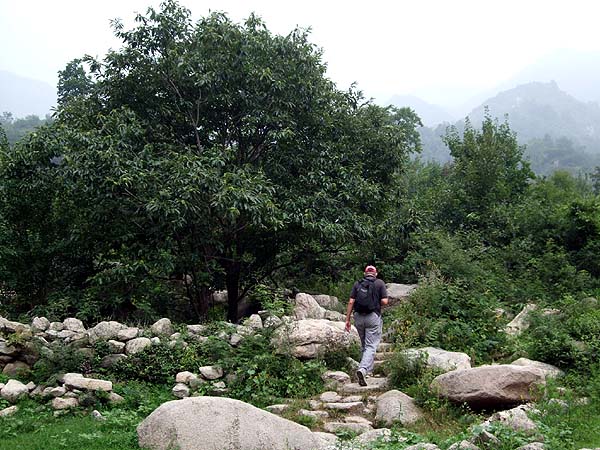 By now we had been going for an hour and what we once called the 'lost Fukawee Tribe' effect was kicking in as the rest of the group waited while I did a 'recce' for the final climb to the wall: It was only about 50 metres but it was totally overgrown, eventually we got a great view of the hordes of tourists on the wall by looking back towards the entrance, these days many of them here are from overseas. Looking ahead, the restored area ends about 2/3 of the way above the watch-tower in the centre of the picture. With an electricity cable strung along the side of the wall here, there's some kind of trail just below it, you just have to watch out for flying litter from above... Somehow, we found ourselves mixing briefly with the more moneyed gentry, the alternative to this steep ascent would have been the worst part of the alternative 'off-piste' section; the climb held no terrors for 16 year old Yiran. The senior members of the team took it rather more slowly. Immediately beyond this point the wall is currently under restoration and this section is strictly off limits. So, much to the chagrin of the workers 'gaffer' we headed back into the forest again following the trail paralleling the wall - we had used this successfully before, it may be used by other hikers or by the nut gatherers. We knew there were places where the wall had collapsed so rejoining it would not an issue. At last after 3 hours, we were now on the Wild Great Wall! Click here for our Private Great Wall Hike Part 2. |