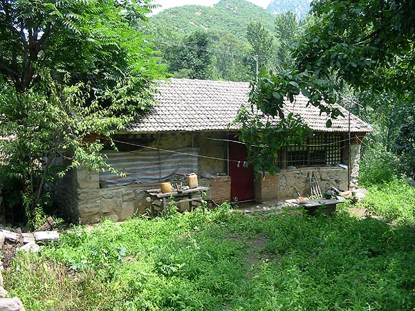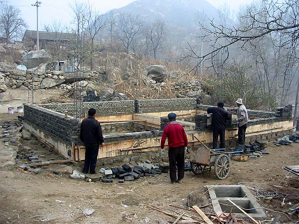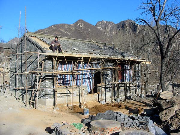 By September 2009, my modest UK pension had 'shrunk' considerably owing to the decline in the value of the pound sterling and we decided we needed to realise the value of our two smaller houses. We sold them both to a young Beijing couple who appeared sympathetic to our way of doing things in Jiaojiehe, at least they haven't dug up the grass lawns (yet). "Buy one, get one free" is a familiar sign in supermarkets the world over these days, but in this case we got a bonus cottage when we bought our second house. It may have looked charming but the reality was that it was in dreadful condition - look at the crack in the right side of the wall owing to subsidence. It had to go.... Our original plan was to rebuild in the original style and make it a bit bigger. Two things altered that, firstly we wanted to make the end result available to Yuehong's elderly father Guoliang and secondly, the base had to be raised so that it could be connected to the new village waste water system. As he did with our original house, Guoliang directed the construction of the external shell and roof: By December 2006, the house was almost ready to hibernate for the winter, to be completed by Summer 2007. We made the house "winter resistant", such that its energy bills will be minimised. This is how I shall remember our true 'country cottage', small but perfect in every way, with 'all mod cons'. We spent a couple of idyllic weeks shacked up here, officially we were here to road test the heating (and more importantly the insulation). Both passed. |