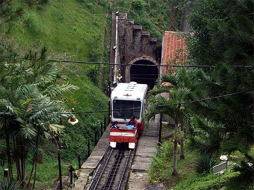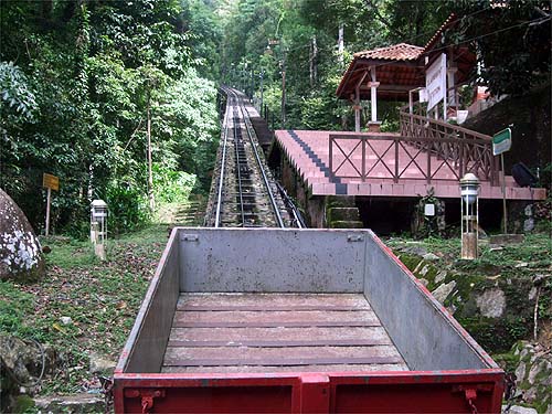 For convenience I have now grouped lifestyle illustrated features by topic: After our visit to Burma and transit in Thailand, we had an extended visit to Penang - click here for the main index page. There is a glimpse of the 'new railway' elsewhere on this site. 'Funiculi, Funicula' - the Penang Hill Railway on DVD - Now available! I bought 'Penang - Trams, Trolleybuses & Railways' by Francis & Ganley, published locally in 2006 by Areca Books, ISBN 983-42834-0-7, excellent value at MYR 50. I found a copy in MPH at the Gurney Plaza near Bagan Jermal but no doubt it is available elsewhere. Thomas Kautzor tells me it is described on Areca's website and can be bought from them by credit card - http://www.arecabooks.com. I have added some pictures taken in the 1970s just before the new cars arrived (20th November 2009) - click here. Despite the date Penang Hill Railway actually opened in 1924, it is a classic cable funicular operated in two sections, each with two coaches: