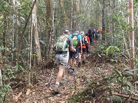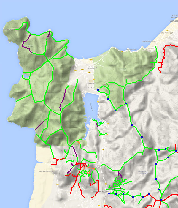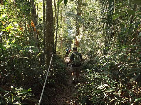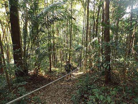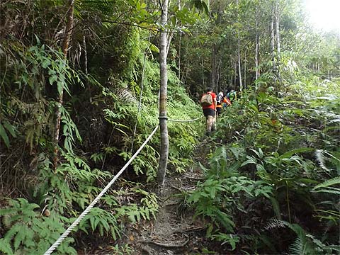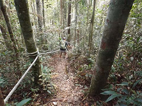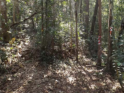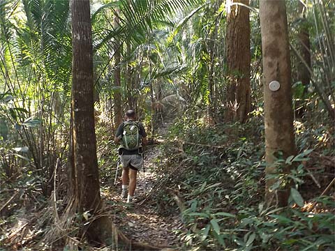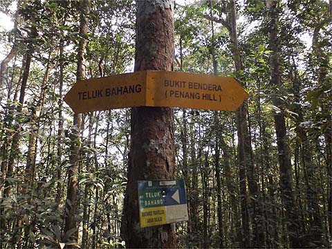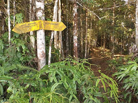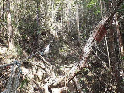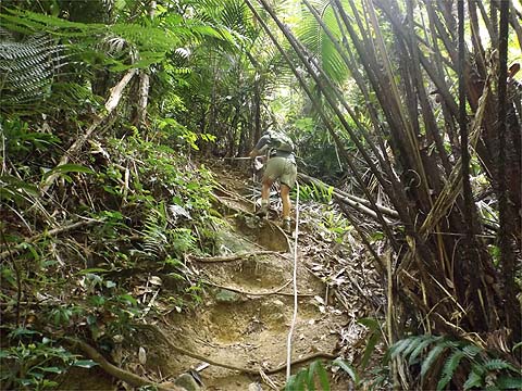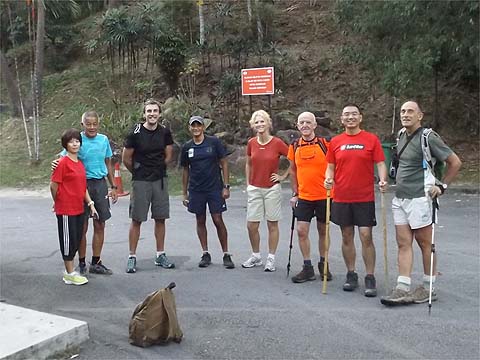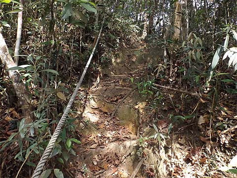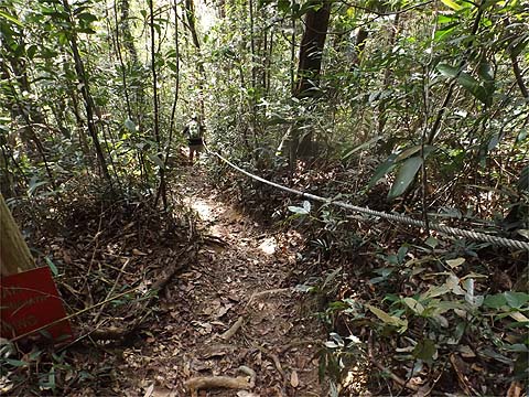 This is one of a series of pages on walking the hills of Penang, click here for the index. This is a long, hard Grade 3 walk, with some of the rope work some might consider it to be Grade 4. There is a sketch map at the bottom showing the route followed. Click here for a list of the known PBA rain gauges. This account is linked from my Penang Peaks page which lists peaks over 400 metres as well as other places of interest and viewpoints. To find other hikes which visit this peak please check the maps of this are using this link. Please visit my Penang buses page for information on accessing the starting point. We'd got to know Penang resident Mike Gibby through a mutual interest in both of the Penang Hill Railways and he arranged for me to join a group to take on what is widely considered to be Penang's toughest hike. Penang's highest point, Western Hill, lies in a sensitive security area and it's currently impossible to access, particularly from the north coast of the island - hikers can access a point close to it from the Batu Ferringhi aqueduct or from above the Botanical Gardens but have to descend on the other path or return the same way. Bukit Laksamana is the second highest point (outside the main range), and is accessed by narrow ridges whose steepness requires the provision of ropes. However, as long as you obey the principle of three points of the body in contact with the ground at any instant, a reasonably fit person should not find it more than 'challenging'. Certainly I felt tested by the experience, but this is definitely not one for the single hiker, you could wait a long time for help if you turned an ankle or worse. Yuehong generally doesn't like routes with ropes and stayed home, she's currently thinking about whether to try it... We gathered at Taman Rimba (Forest Park) next to the Teluk Bahang Dam for an 08.00 departure. We were a very mixed bunch, most had done the walk at least once before and had a better idea than I what to expect. That's an early start by my standards and the light levels were still low, at least it was quite cool. There are a number of marked trails within the park, we took the main one up and soon got to 'Junction 1' where our route was clearly marked to the right. There are precious few junctions after leaving the park area, this means it is difficult to get lost but also that there is no real option of an early exit. If you don't like what you see you will have to return down the same trail.