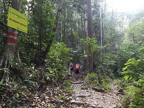 The sign says 'no entry' and in this context means not to wander off the trail; of course we took the branch that climbed. This meant we left the valley behind our starting point and were heading up to the main ridge that runs from the north coast west of Batu Ferringhi all the way up to the summit of Bukit Laksamana. So it was quite steep, ropes were provided, but were not really needed, maybe exhausted hikers coming down in the opposite direction would have appreciated them. When eventually the path levelled out it was clear that we were approaching that ridge.