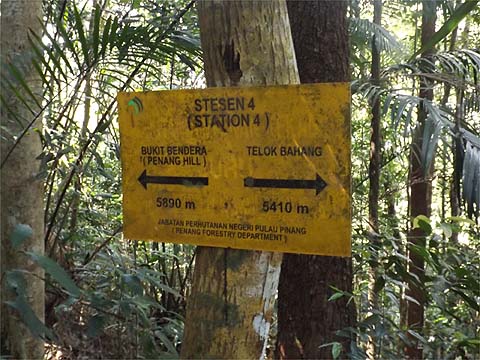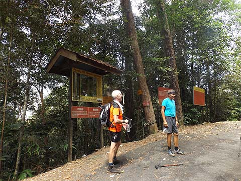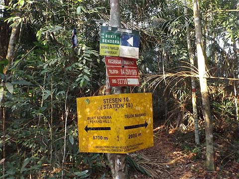 There, we were at the only significant junction of the hike. As everywhere in the world, authorities feel the need to protect their backsides. It was a Sunday, I guess phoning the emergency number wouldn't have been much use. The station signs were a regular feature but as they don't give the height they are of limited use, I'm sure the height here is available on some electronically tagged trail but my terrain map suggests we were already above 300 metres and maybe 400 metres. Further, you can subtract 4700 metres from the distance to Penang Hill as that last section is on tarmac. At this point we were joined by the trail up from the Chin Farm and this would have been an alternative (but longer) way down. It had been a hard first (nearly) hour.