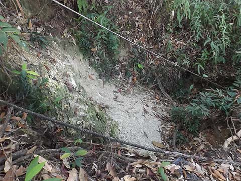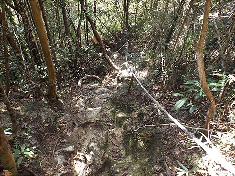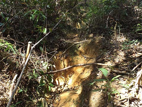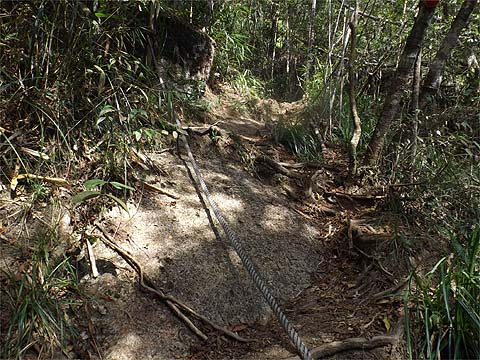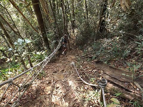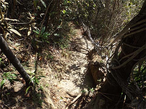 First gear stuff, no doubt about it, the tree roots had proved more durable than the concrete blocks. Looking back as we entered a small clearing you could be forgiven for imagining that the path was level, the presence of ropes tell another story.