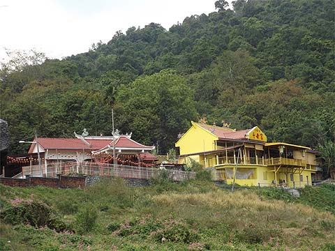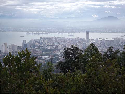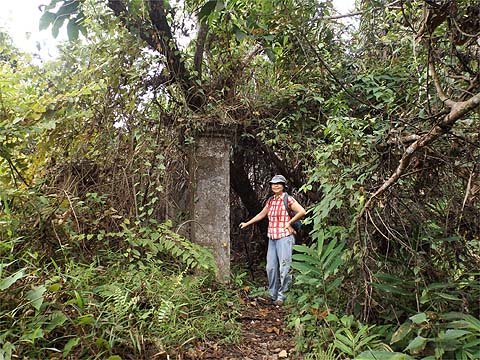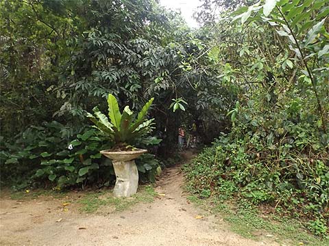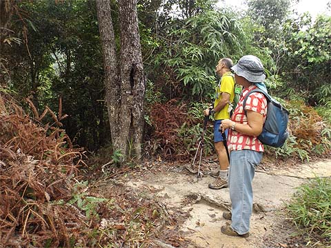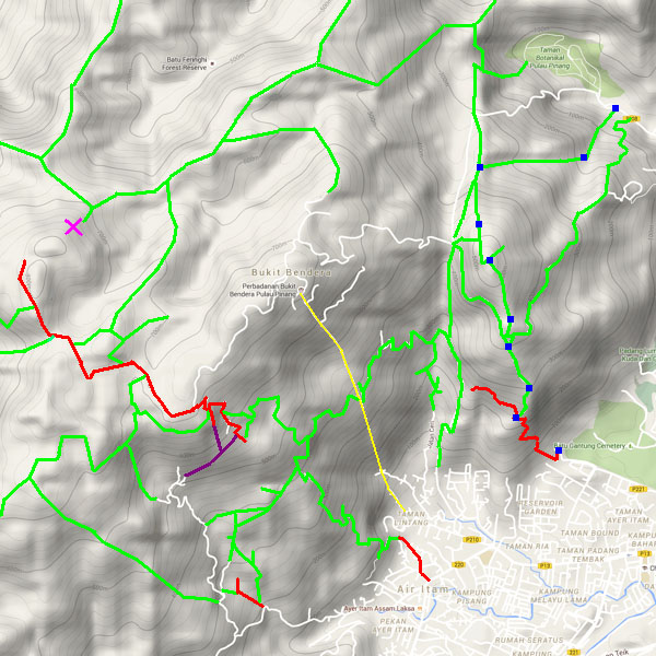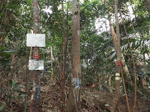 This is one of a series of pages on walking the hills of Penang, click here for the index. This is a Grade 3 walk. There is a sketch map at the bottom showing the route followed. Click here for a list of the known PBA rain gauges. Please visit my Penang buses page for information on accessing the starting point. This account is linked from my Penang Peaks page which lists peaks over 400 metres as well as other places of interest and viewpoints. To find other hikes which visit this peak please check the north east area index. Long ago, in the 1970s, I lived in Ayer Rajah Close near the Botanical Gardens and from our home we could look up at Bukit Cendana. Indeed as you will see, I visited it from time to time as arguably it had a better view of George Town than the main hill. So when Mike Gibby offered to take us up a path which didn't involve the Moon Gate Path, the Jeep Road or the notorious steps, I jumped at the chance. In the event that day we had to come back down one of the dreaded trio as we had a car parked up, but I have now altered the final section in view of our checking out the path to '39' from the Rifle Range Flats. The start of the walk is this modest entrance in the bushes between the Moon Gate and the Botanical Gardens. You'll know you've got the right trail if you see this water pipe, hence the local hikers call it the 'black pipeline trail'.