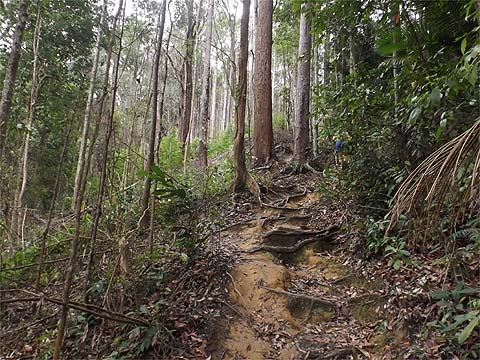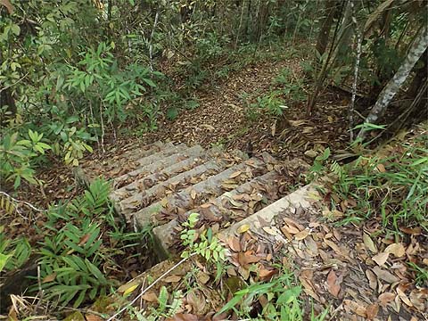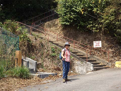 Very soon you'll come to an open area known as '39' where regular hikers from the Rifle Range Flats gather. From the far end, a flight of steps starts to descend beyond the marker stone. Basically there are good steps as far as '29' and a concrete road thereafter. You can see what the route is like by reading the account of the climb in our report entitled 'The 39 Steps'.