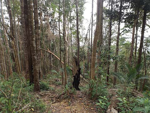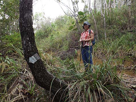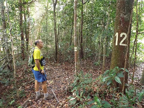 We trailed in at a junction, where someone had decided to number a tree '12'. If we had turned sharp right here we would have come out at '48' on the Jeep Road which is near the top of the steps from the Botanical Gardens. Instead, we carried on up the ridge past tree '13'.