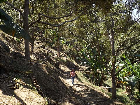 This is one of a series of pages on walking the hills of Penang, click here for the index. This is a Grade 3 walk. There is a sketch map at the bottom showing the route followed. Please visit my Penang buses page for information on accessing the starting point. This account is linked from my Penang Peaks page which lists peaks over 400 metres as well as other places of interest and viewpoints. To find other hikes which visit this peak please check the maps of this are using this link. We've been actively exchanging walks with Penang resident Mike Gibby and now we had established that he was not as destructible as just about everyone else whom we have deigned to allow to accompany us, it was time to ratchet up the 'degree of difficulty' and throw in some 'South of the Island Ridge Paths' which unlike their northern counterparts come as an obstacle course. We'd had a spot of bother with doing the Nanshan to Anjung Indah path southbound, the first time we fouled up completely and the second time we made the same wrong turning but were able to turn back. Today was arranged so we could demonstrate that we could consistently get it right. I've recycled some of the pictures from the first two walks. We'd dragged Mike onto our standard Balik Pulau start with the 501 bus from Teluk Bahang and walked up to the Spice House on the valley road to Air Itam. We went down the side to the chicken shed, there are two paths here, we knew to ignore the one on the left next to the shed as it would lead to a house with many dogs.