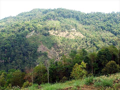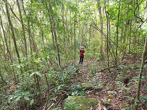 There was a rough trail heading west but there was no thought to use it, such creatures are notoriously hard to follow down. Instead we went north-east along the ridge towards Malihom, passing these large rubber trees which gave some indication of just how long ago it was that the area was abandoned. Where the land in front of us started to go downwards, I knew we should turn right for a gentler descent.