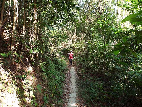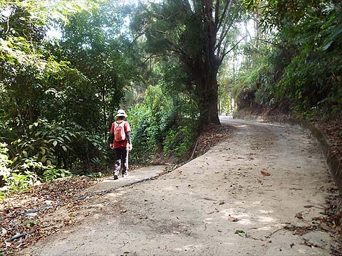 We walked across the dam and up the side of the work area to join the wide path out to the right. It's a good way to warm up, it follows the contours and there's one junction where we kept left. Soon we reached the concrete road that comes up from the Buddhist temple by Kek Lok Si, "KWARN INN SAHN POW YIN SIAN TSI(P)" - if you don't have a car this is the way to join the walk.