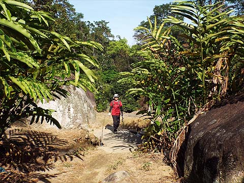 The last time we saw 'F3' was on the descent to Pantai Mas, I assume they are some kind of hiking group. By now we were about half way up and had reached the first of three minor peaks. That's a 'Moniot stone' in the foreground, a survey marker.