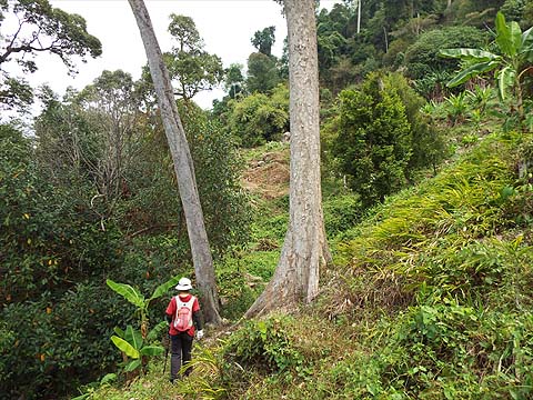There were a couple of discarded drinking water bottles but, as we had expected, no sign of a regularly used path. The plan was to turn left and follow the ridge down to a col and then turn right to descend to a valley above the small Chinese settlement on the other side from our ascent. We hadn't known what to expect but there was some abandoned young rubber at the summit and then a succession of old rubber terraces. We used the remains of tapper's trails to drop down steadily, making sure we kept close to the ridge, not difficult as it was much steeper on either side.