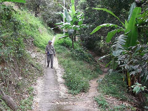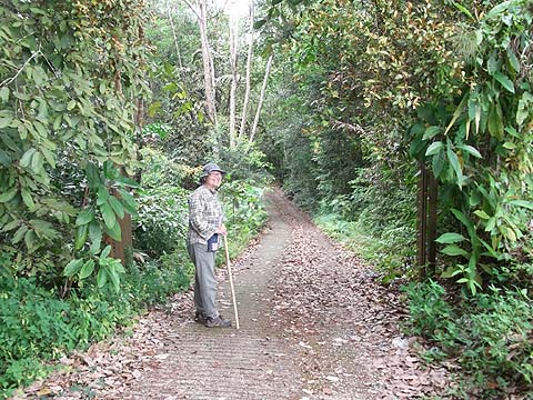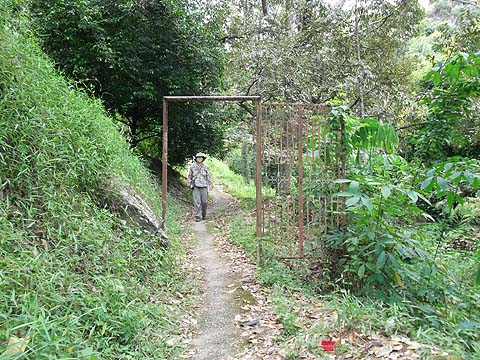 This is part of a series of pages on walking the hills of Penang. Click here for the index. This is a Grade 2 walk. There is a sketch map at the bottom showing the route followed. Please visit my Penang buses page for information on accessing the starting point. We repeated this walk in January 2015, November 2015 and November 2016 without the side trips, the route remains exactly as before. The 501 bus service referred to in this report had been withdrawn by September 2022. This makes this hike impractical for anyone without the use of a car. This was a trail that was fast acquiring the status of a (non) urban myth. I had once read on the web about a mountain bike ride along it and had met a European who told me he had done it but could furnish no more detail other than the fact that he had come out just above the Tropical Fruit Farm on the round-the-island road. So when I met Dave Ray while we were both taking a snack in Teluk Bahang and he told me he had done it barely two weeks before AND had a trace on his mobile phone, I had to sit up and take notice even though it was barely 5 minutes before our 501 was due to take us out to the south end of the island. The upshot was that I got a paragraph of instructions and what follows is entirely down to his passing on his own experience. It's a great walk and, what's more, one where you will have to try very hard to get lost - at least in the downhill direction which we followed. We did plan to get the 09.45 501 bus from Teluk Bahang, but the schedule slipped more than a little and it was the 12.00 service that we caught (note since then the bus has been retimed, see above). We got out at the appointed spot, some 400 metres before the summit. As I walked up, my wicked wife said "There's a gate!". She might have added that it was wide open...