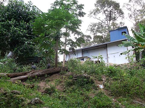What I had expected to be the most challenging part of the walk turned out to be anything but. We soon joined another motorbike trail, this is it looking back, I'm not sure where the left fork leads to, it must be towards the Teluk Bahang Dam. If you are doing this walk in the reverse direction and don't want to find out, take care here to turn right as it's not that obvious a junction. At the top of the first rise we came upon this incomplete house, on the post next to Yuehong are stickers from some 2012 mountain bike jamboree (http://www.kotrt.com.my/kayuh_lasak_overview.html (link broken by December 2021) and http://www.mapmyride.com/routes/view/157433641) which confirmed that among certain sections of the 'fresh air community' this is actually a well known trail, hardly a 'Secret Garden' at all.