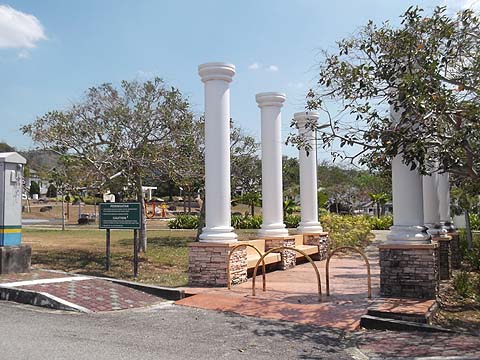 We came out at the main road through the development, just where the 404 Pantai Acheh bus does a U-turn after taking a diversion in here. Actually making allowance for the fact that these are town houses dumped in the middle of the countryside, they don't look too bad from the front, but I have to say that I'm not too keen on the back gardens: