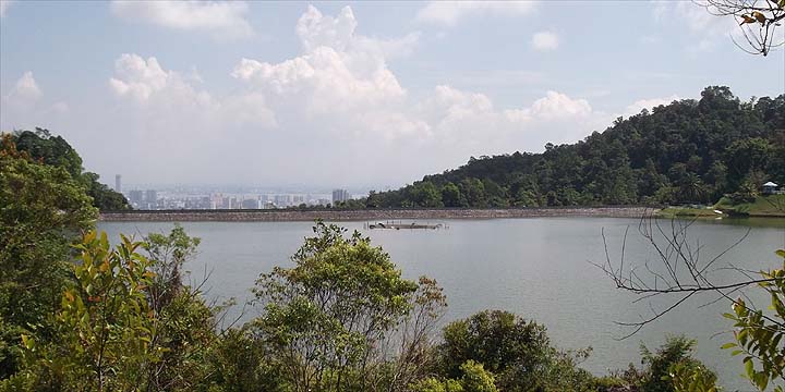 This is one of a series of pages on walking the hills of Penang, click here for the index. This is a Grade 3 walk, based mainly on length although there is a short awkward section. There is a sketch map at the bottom showing the route followed. Please visit my Penang buses page for information on accessing the starting point. Although this description starts from the Air Itam Dam, most likely you will actually start from Air Itam (502, 201, 203 or 204 bus, the 502 being by far the best option as it is the most direct service). How to get up to the dam is covered in several other walks, click here for more information (The Road to Nowhere Walk) which also covers the initial climb from the dam which is, however, repeated here. Some of these pictures have been recycled from previous walks in this area to save on server storage space, hence Yuehong's apparent double change of garb during the walk! Cross the dam and walk along the road which runs on the west side of the water.: