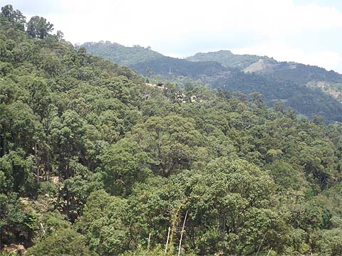 This is one of a series of pages on walking the hills of Penang, click here for the index. This is a Grade 3 walk verging on the Grade 4 if you are a cissie. There is a sketch map at the bottom showing the route followed. Please visit my Penang buses page for information on accessing the starting point. IMPORTANT As of January 2024, the route south from Anjung Indah has been blocked by a new owner with a security fence backed up by razor wire. This is the second in a series of walks which build on each other as we explored the region between Anjung Indah and Relau. It would be sensible to read the first report before this one as it assumes some existing familiarity with the area. The final two reports are based on the first two. Two days earlier at Yuehong's instigation, we had had a very successful initial investigation of the area below the Anjung Indah masts, always allowing for the 'thud and blunder' element which wasted the best part of an hour and a half. Today we went back for 'more', judge for yourself whether it was as successful or not, but we had a whale of time. We took a 502 bus most of the way up to Anjung Indah and walked back to a concrete road above our usual starting point which had always tempted me (at km 5.3). It's easy to miss but it turned out to be pure gold. The concrete didn't last very long, but at the first hut someone had started to blast a road up the hill, it looked inviting.