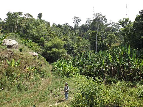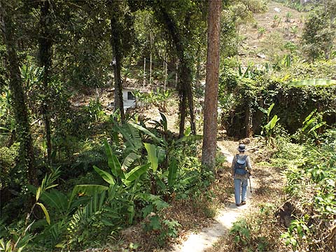 At the bottom we came to some very young rubber and followed the top terrace right. We could see a trail coming up which we eventually joined. In fact we could have come straight down from the hut although that route was not in good condition. It was a good concrete path, someone spotted a house below and said 'Easy La!'.