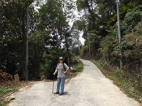 It was now just a question of following the path along the contours, the Areca palms made for an unusual hedge. The electricity poles were a sure sign we were heading back to the main road and for the last part we were on a concrete road as we approached the key junction at the summit of the Bailk Pulau to Air Itam Road.