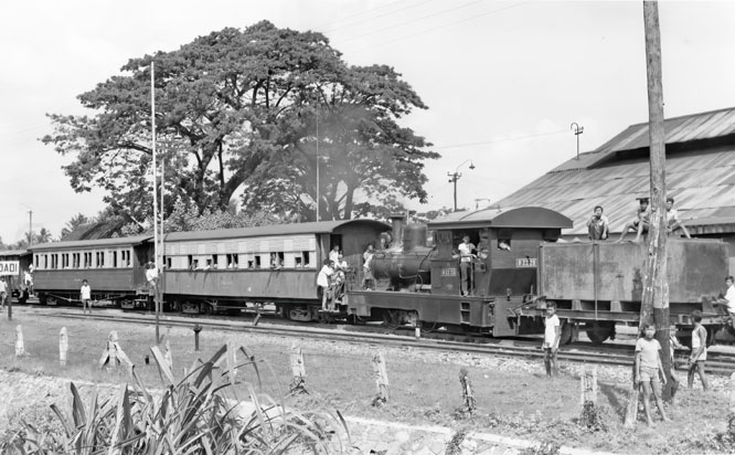 B2220 heads out west past the shed at Purwodadi. On these pioneering trips, with so much to see in a short time, trains subject to cancellation and no common language between visitors and staff, finding and photographing a train was a matter of pot luck. (FJ, ILS collection) |