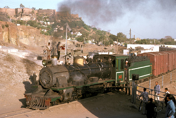 The longest of the three lines was that to Sheopur Kalan. In January 1976, NM 762 is on the 15:45 663 Down which ran only as far as Sabalgarh, approximately half way, on the hill behind is the magnificent Gwalior Fort. (RD) |