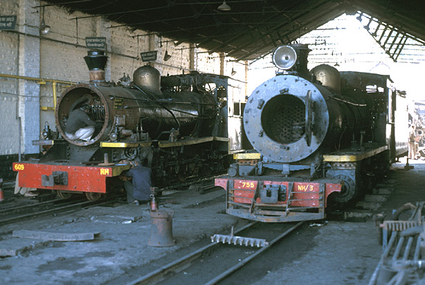 Inside Gwalior shed, NM 609 and NH/3 755 were getting attention on 24th February 1986. The NM was numbered out of sequence as it had previously worked the Western Railway's closed line between Ujjain and Agar which like these lines was once part of of the Scindia State Railway. (PM) |
