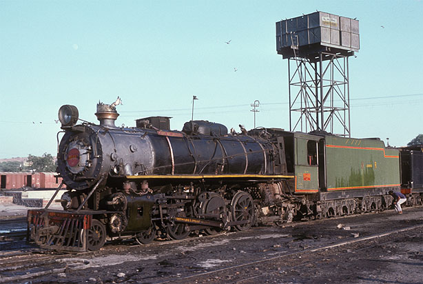 The Baldwin HP 4-6-2s were 'Queens of the Desert' with their giant 12 wheel bogie tenders. The initial batch from 1924 were successful and followed by a slightly modified batch in 1948. 31414 was one of these and seen at Jodphur on 6th November 1976. Named 'Fort of Jodhpur' it was considered the royal engine. (RD) |