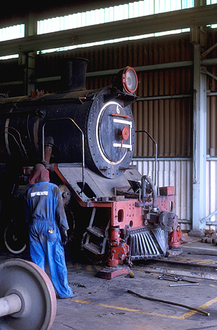 One of the staff inspects the front of LO 806. The locomotive is jacked up for its repairs and the bend in its steps suggests that its condition is not entirely due to 'fair wear and tear'. (MS1) |