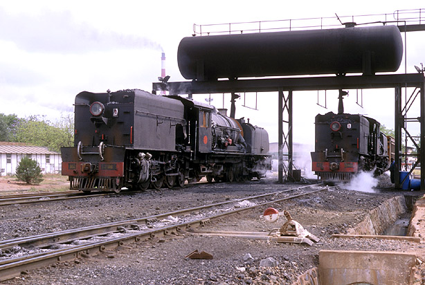 Next stop was the water tank. Filling LO 809 and 811 simultaneously was an unnecessary luxury because traffic levels at the time really only justified a single locomotive. So that the locomotives would not have to return to the shed, the tank was located by the dumping bins. (MS1) |